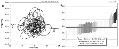 Cuarenta y ocho cristales de circón se seleccionaron y se realizaron 59 ablaciones. Para el cálculo de la edad 206Pb/238U se eliminaron 10 datos con discordancias>10 y errores>5. Las edades obtenidas y aceptadas varían entre 220,15±7,55 Ma y 252,5±8,15 Ma (Fig. 11a). Se obtuvieron 49 datos en bordes y núcleos de cristales sin mayores diferencias de edad, que arrojan una edad promedio de 233,1±1,4 Ma, con MSWD=1,8 (Fig. 11b) y relaciones Th/U entre 0,11 y 0,27. La edad se interpreta como edad de metamorfismo de la roca.
