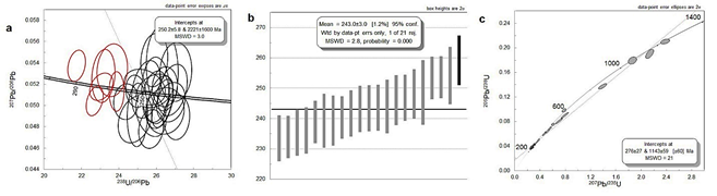 Figura 15: Geocronología de la muestra GR-7072. a) Diagramas de Tera Wasserburg de la edad de metamorfismo triásicas y en rojo datos Pérmicos; b) edad media ponderada y c) concordia Tera Wasserburg con herencias.