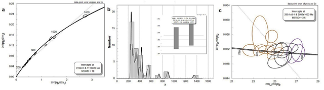 Figura 19: Geocronología de la muestra CSB-301A. a) Diagramas de concordia Tera-Wasserburg con la edad máxima de depositación, b) edad promedio ponderada que representa la edad máxima de depositación de la roca y c) diagrama de concordia Tera-Wasserburg con edad media ponderada y herencias.
