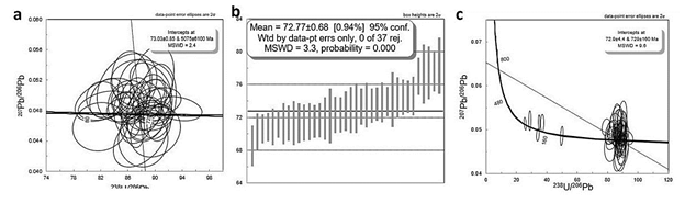 Figura 13: Geocronología de la muestra CSB-301B. a) Diagrama de concordia Tera-Wasserburg con edad de anatexia, b) edad media ponderada anatexia y c) diagrama de concordia Tera-Wasserburg con edades de metamorfismo, anatexia y sus herencias.