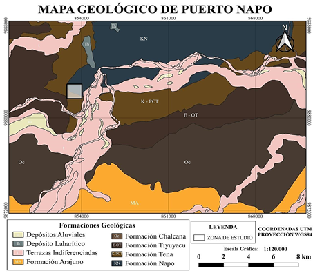 En la Fig. 1 se visualiza el Mapa Geológico de Puerto Napo, correspondiente a la zona de estudio y en el cual se distingue una secuencia sedimentaria cretácica conformada por la formación Napo, varios cuerpos ígneos básicos alcalinos han sido identificados en esta misma sección cretácica; suprayaciendo se encuentra la formación Tena de edad paleocénica, posteriormente, las formaciones Tiyuyacu y Arajuno, cubiertas principalmente en superficie por depósitos aluviales cuaternarios, que forman terrazas aluviales con acumulación de minerales de interés económico como el oro (Carlomagno,2010).