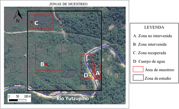 La ausencia de información técnica tanto de catastros, informes y demás, ocasionaron que las zonas de estudio fueron ubicadas según la referencia provista por los comuneros y de forma aproximada. Tras la selección del área de estudio, se buscó e identificó las fincas o terrenos que habían sido utilizados para la actividad minería, obteniendo una zona intervenida o explotada, una zona no intervenida, una zona recuperada por reforestación y un cuerpo de agua, en este caso el río Yutzupino, afluente del río Jatunyaku, teniendo en total un área de estudio aproximada de 14 hectáreas (Fig. 3). Esto para realizar una correlación entre las características fisicoquímicas del ambiente, tanto del suelo, agua y relieve, con el objetivo de identificar las diferencias existentes y determinar su impacto.