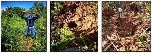 Se realizó el reconocimiento del lugar y se tomó en cuenta las necesidades requeridas, las cuales son que cuente con accesibilidad, áreas intervenidas y no intervenidas y que se ubique cerca al río, en este caso el Yutzupino. Después, se observó y se describió la geología local en cuanto a rocas y las características del relieve, para lo cual se determinó la formación geológica presente y la litología, así como rasgos generales. También, con la ayuda de un barreno se hicieron pequeñas calicatas de entre 30 y 40 centímetros de profundidad, para identificar capas y espesores, así como texturas y colores del material geológico (Fig. 5). Por otra parte, se hizo un levantamiento de información con un dron, de la marca DJI Phantom 4 con cámara de alta definición, permitiendo obtener un modelo de elevación digital y una ortofoto actual de la zona investigada.