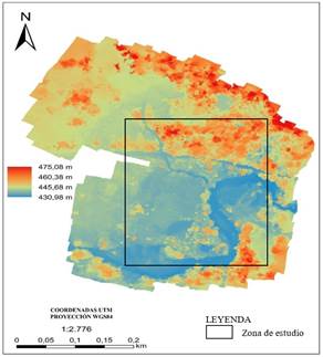 Figura 6: Modelo de elevación digital del área de investigación. Las mayores alturas se representan en color rojo y pertenecen a la copa de los árboles.