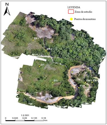 Figura 4: Ubicación de los puntos de muestreo de agua y suelos. Leyenda: ZR1: zona recuperada 1; ZR2: zona recuperada 2; ZI1: zona intervenida 1; ZI2: zona intervenida 2; ZNI1: zona no intervenida 1; ZNI2: zona no intervenida 2; Y1A: aguas arriba río Yutzupino; Y2B: aguas abajo río Yutzupino.