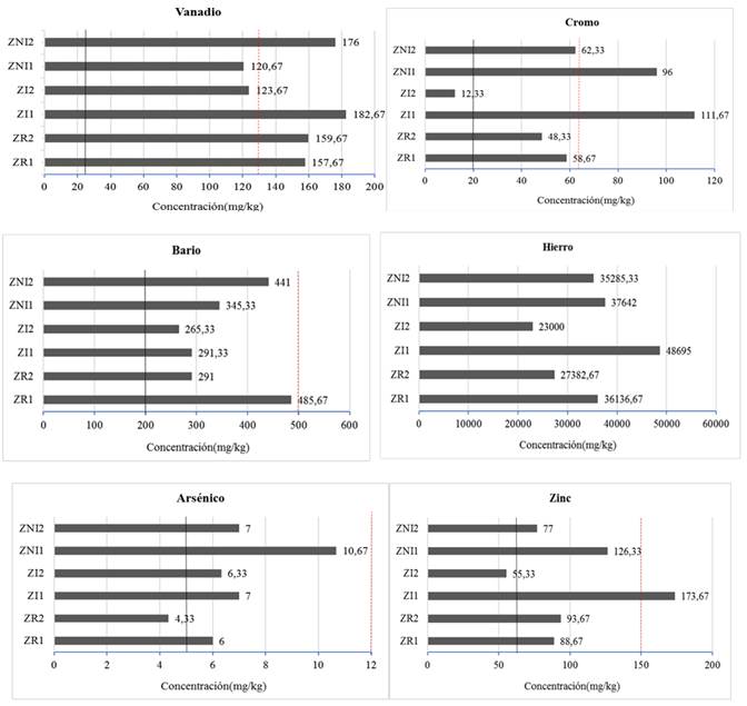 En todas las muestras los valores de hierro son altos, pudiendo ser la razón por la cual las muestras de suelo presentan un color rojizo. De igual manera, a excepción de la muestra ZI2 todas tienen un valor de zinc que sobrepasa el límite permisible de la legislación ecuatoriana, pero no del CCME. Todas las muestras excepto ZR2 presentan valores sobre el límite para el arsénico, en función de la legislación nacional, en el caso del Bario todas las muestras lo superan, pero esto no sucede para el límite del CCME. Además, las muestras ZR2 y ZI1 superan el límite permisible nacional para el plomo.