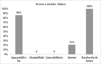 En promedio, en los hogares viven 5 personas, teniendo un mínimo de 2 y un máximo de 7 miembros. En el 85 % de las familias los integrantes se dedican a trabajar y a estudiar, en el 15% restante hay integrantes que no estudian ni trabajan. De las 14 encuestas, solo 7 personas manifiestan que son propietarias del terreno donde viven y el resto viven en terrenos de propiedad de la asociación comunitaria. En la Fig. 11 se indican los porcentajes de personas encuestadas con acceso a los servicios básicos.