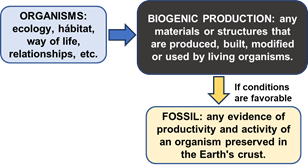 Organisms live in relationships with others and with habitats and produce materials (BP). Biogenic production could be preserved in the sedimentary record as fossils if conditions are favorable (Fig. 1). Fossils are the evidence of past life on Earth.