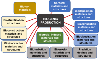 Biogenic production includes the following five groups: directly production (corporal, biodeposition, bioexhudation, and bioclaustration materials and structures); bio-modified materials and structures (predation, bioerosion, and bioturbation); bio-built materials and structures (biofoodcaches, bioconstructions, and biogenic sedimentary); unique modified-created materials and structures (microbial induced materials and structures); and bio-used materials (biotools).