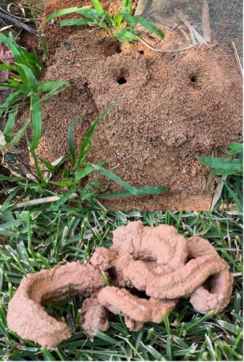 Figure 7: Biodetritus waste-dumps (BDWD) are loose materials removed during the maintenance and cleaning of their shelter. A) BDWD by ants with entrance and ventilation shaft (arrow) to the shelter galleries of the colony. B) Earthworm (Lumbricus terrestris) castings (mud pancakes) consist of a mix of earthworm fecal matter and detritus (Piedecuesta, Colombia). Fossil evidence of BDWD is presented in [106,107,108], among others.