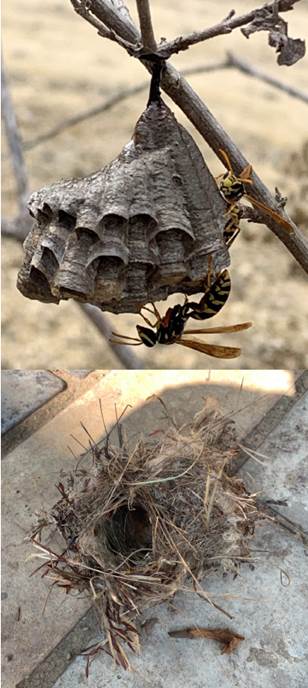 Figure 8: Bioconstruction samples. A) The wasp nest of Polistes (Zapatoca, Colombia) comprises chewed plant fibers and saliva. B) Bird nest, made up of fibers of plant detritus, feathers, and other materials. Examples of fossilized bioconstruction are presented in [121,122,123,124,125], among others.