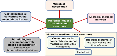 Microbial-induced materials and structures include microbial desiccation, microbial-induced minerals, microbial-mediated cave structures, coated microbial concentric-ovoid, and microbial-induced gases.