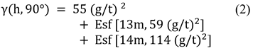 constituye el valor medio de la función γ cuando un punto x se mueve en el espacio de un punto A a la coordenada x+h ubicada en un punto B. A pesar de la impopularidad de las técnicas geoestadísticas, debido en su mayoría a la complejidad matemática que requieren, existen de igual maneta una serie de propuestas para la clasificación de recursos, en su mayoría basadas en el error estandarizado de la varianza KOB. En el proyecto minero objeto de estudio, se diseñaron unidades de minado de 5 m * 5 m para efectos de la homogeneidad de los resultados; sin embargo, otra opción viable para el diseño de bloques o unidades de minado es el de utilizar el 50% o el 100% de la persistencia de la mineralización (es decir, del rango de influencia) del variograma anisotrópico de la Fig. 4, obteniéndose unos bloques de 17 m * 7 m o 34 m * 14 m aproximadamente (ver Fig. 7).