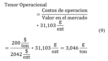 Los resultados de las curvas QTM se resumen en la Tabla 2. Para un tenor de corte de 1.56 Au g/ton, obtendremos el mayor tonelaje posible para los recursos, computarizados en 38.250 toneladas, con un contenido de metal de 14.288 onzas de oro y un grado promedio de 11,62 Au g/ton. Nótese que un aumento en el tenor de corte representa menor tonelaje, menor contenido de metal y mayor grado promedio. Esto nos da una aproximación inicial del tamaño general del depósito en términos de recursos, que son necesarios investigar desde un punto de vista del planeamiento minero para establecer el inventario de reservas minerales. Miremos el caso de una mina pequeña, que tiene el objetivo de producir 20 toneladas por día (ton/d). Si consideramos unos costos operativos de 200 $US/ton y tomando como referencia un precio del oro en el mercado de 2.042 $US/Ozt (1 oz troy = 31,103 gramos) entonces podemos calcular el tenor operativo según la eq. (9):