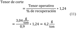 corresponde al espesor promedio de la veta y ER corresponde al espesor de la roca estéril. Finalmente, al multiplicar el tenor operativo por el factor de dilución y dividirlo por el porcentaje de recuperación (el cual establecimos en este caso en un 90%) obtenemos el tenor de corte como se muestra en la eq. (11).