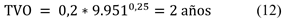 Finalmente, los recursos medidos e indicados deben ser afectados por el tenor de corte calculado en la sección anterior (4,2 Au g/ton), de esta manera podrán ser considerados reservas minerales probadas y reservas minerales probables, ya que los resultados obtenidos al aplicar este criterio reflejan que estos recursos cumplen con superar el tenor de corte. Taylor (1977), propuso una fórmula empírica para estimar el tiempo de vida óptima de un depósito (TVO) [8]; en este caso con 9951 toneladas de reservas minerales (probadas + probables), la ecuación propuesta (eq. 12) quedaría de la siguiente manera: