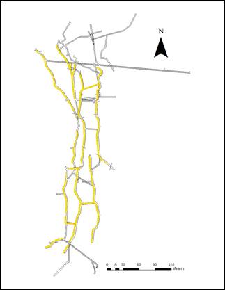 Figura 1: Mapa de Desarrollo minero (líneas negras) y puntos de muestreo (en amarillo) de un filón de cuarzo auroargentifero mineralizado con pirita, esfalerita y galena.