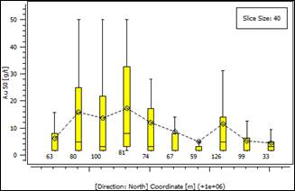 Figura 2: Gráfico de franjas (Swath plot) de la variable oro para tenores inferiores o iguales a 50 Au g/ton en la dirección norte.