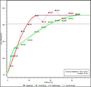 Figura 4: En este caso el efecto de pepita [55,33 (Au g/ton)2], representa el 24% de la varianza real [228,6 (Au g/ton)2]; equivalente a la meseta del variograma. Se observa además como la varianza estadística [202,7 (Au g/ton)2] subestima en un 12% la varianza real en este depósito de oro. El efecto pepita puede ser debido a que entre el 40-45% de plata y oro en este ocurren como pequeñas inclusiones dentro de la estructura cristalina de los sulfuros, mientras que entre el 55% y el 60% restante del oro ocurren en forma nativa.