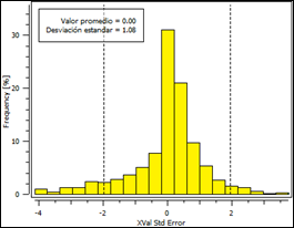 Según Chiles y Delfiner (1999), para considerar que un modelo es representativo del fenómeno en estudio, debe cumplir con los parámetros de validación descritos a continuación. 1) un promedio de los errores cercano a cero, 2) una desviación estándar de los errores cercana a 1 (Como se muestra en la Fig. 5), 4), un rechazo de los datos estimados inferior a un 10% (es decir, aquellos datos que queden por fuera de los umbrales establecidos con base al nivel de confianza) [1], y un parámetro adicional sería una buena correlación entre los datos estimados y los datos reales.