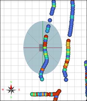 Figura 7: Diseño de bloques de minado de 5 m * 5 m en contraste con el elipsoide de búsqueda, las dimensiones de este último elaboradas automáticamente conforme a la persistencia de la mineralización (i.e rango de influencia del Semivariograma).