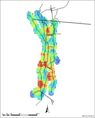 Figura 8: Mapa de bloques estimados por KOB y reclasificados por colores según los cuantiles 5, 25, 50, 75, 90, y 98 de los tenores estimados.