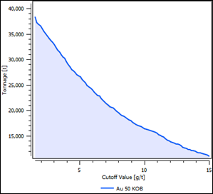 Figura 11: Reporte de tonelaje vs tenor de corte para las estimaciones realizadas por KOB de la variable oro.