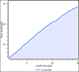 Figura 12: Reporte de grado promedio vs tenor de corte para las estimaciones realizadas por KOB de la variable oro.
