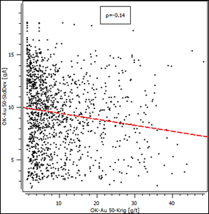 Figura 13: El coeficiente de correlación es de sólo 0,14, es decir bastante bajo. No existe una relación entre los tenores estimados con kriging ordinario de bloques y la desviación estándar de los errores. Por lo tanto, se demuestra que no existe un efecto proporcional.