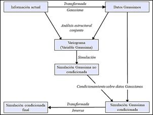 El procedimiento de la simulación condicionada por bandas rotantes (TBS), el cual se resume en la Fig. 14, requiere transformar los datos a gaussianos (Anamorphosis), elaborar un análisis variográfico a la información transformada, ejecutar el método geoestadístico de simulación y por último realizar la transformación inversa al proceso realizado, para ejecutar la cartografía automática e interpretar los resultados. Para realizar la estimación en un modelo de bloques es necesario cuantificar el efecto de cambio soporte de puntos a bloques de 5 m x 5 m, por lo tanto, requerimos de un modelo de la distribución definido mediante una función de anamorfosis gaussiana. De esta manera la varianza de los bloques puede calcularse mediante la relación de Krige que da la varianza de dispersión en función del variograma.