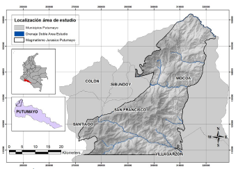 El área tiene 1.254 km² de extensión y en división geográfica corresponde de forma porcentual de mayor a menor medida a parte de los municipios de Mocoa, San Francisco, Santiago y Villa Garzón; en la Fig. 1 se presenta el área municipal de cada uno en relación con el polígono del área de estudio.