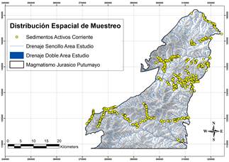 El área de estudio comprende un polígono enmarcado por el cinturón de rocas de edad principalmente del Jurásico, que aflora en el área norte del departamento del Putumayo. Dentro de este polígono, existen rocas de edad diferente al Jurásico y que representan el 8% del total del área, además de tener en cuenta que las muestras son de sedimentos activos de corriente los cuales representan un área (cuenca hidrográfica) y no un punto, razón por la cual fueron incluidas dentro del área de estudio.