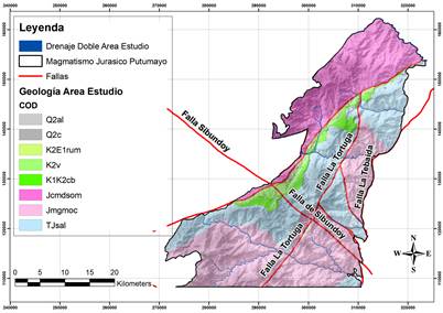 En la Fig. 3 se presenta el mapa geológico y de estructuras principales en el área de estudio, tomado y digitalizado de la plancha 430 Mocoa [5, 6].