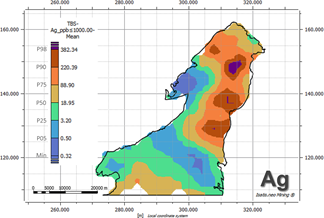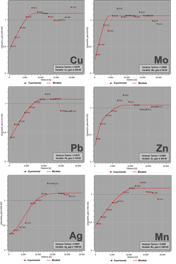 En la Tabla 1 se presentan las estadísticas básicas procesadas por el software para las variables filtradas sin duplicados y sin valores extremos de Cu_ppm, Mo_ppm, Pb_ppm, Zn_ppm, Ag_ppb y Mn_ppm. Para las variables Cu, Pb, Zn y Mn, el conjunto de datos es de 443 muestras; para el Mo se cuenta con 384 datos y para la Ag se cuenta con 387 datos. Estos dos últimos elementos tienen menor cantidad de muestras debido a inconvenientes que en su momento no permitieron que se procesaran las muestras.