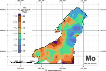 Se permite identificar el comportamiento geoestadístico de las variables Cu, Mo, Pb, Zn y Mn utilizando la metodología de las bandas rotantes para el escenario promedio simulado de 100 realizaciones, como indicadores de mineralización tipo pórfido Cu-Mo, y que se encuentran asociados en dos anomalías regionales de alta importancia y dos anomalías de moderada importancia dentro del área de estudio en el norte del departamento del Putumayo, indicando la necesidad de estudios adicionales para determinar su potencial y delimitar su extensión en el terreno. Las cuatro anomalías generadas corresponden a firmas geoquímicas en la identificación de sistemas tipo pórfido de cobre en superficie y que, mediante la utilización de la herramienta de simulación por bandas rotantes, junto con una siguiente fase de estudios geológicos detallados de alteración hidrotermal, mineralización de sulfuros e identificación de tipos de vetillas, pueden aportar información primaria adicional para reconocer su extensión en superficie.