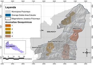 Dentro del cinturón de rocas jurásicas en el norte del departamento del Putumayo se identificaron cuatro anomalías geoquímicas regionales para depósitos tipo pórfido de Cu-Mo con una extensión total de 315,15 km², dos de alta importancia localizadas al este y al suroccidente; y dos de moderada importancia localizadas al noroccidente y sureste del área de estudio, asociadas a eventos metalogénicos del Triásico-Jurásico.