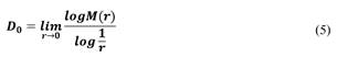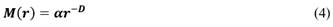 Donde M(r) es el número de cajas de tamaño “r” necesarias para cubrir (2D) o contener (3D) al objeto de estudio. El exponente es la conocida dimensión de Hausdorff [15], que se determina mediante el análisis en regresión de la representación de la relación:
