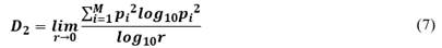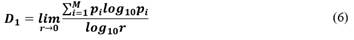 es el término que define el número de eventos en la caja y N el número total de eventos. Si se analiza el numerador de la ecuación anterior, nos damos cuenta que D1 comparte relación con la entropía de información del sistema excepto por el log en base 10.