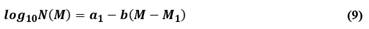 Donde N(M) es el número de sismos de magnitud ≥ M, que ocurren en un intervalo espacio-temporal determinado, a1 es la cantidad de sismos y b es la pendiente que cuantifica el número relativo de sismos grandes y pequeños. Varios trabajos han demostrado la disminución de la pendiente antes de la ocurrencia de grandes sismos.
