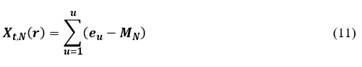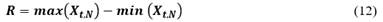En donde: X t,N es la desviación calculada para N períodos, e u es el valor de entrada u, M N es el promedio e u sobre N períodos; siendo el rango R:
