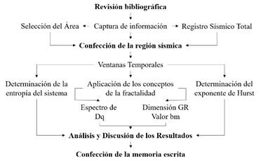 La investigación comienza con una etapa de revisión bibliográfica con el fin de conocer la limitación de las técnicas analíticas propuestas y detectar la presencia de antecedentes relacionados con la temática en el área de estudio. Se compila la información geólogo-geofísica y se clasifica y normaliza de acuerdo a los criterios de calidad del dato planteados por varios autores [3,5,8,16], dando como resultado la confección de la región sísmica (área de estudio con datos sísmicos, estructurales, geológicos y geodinámicos que permiten la caracterización sismo-geológica de la misma).