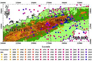 Figura 2: Relación de la distribución de la sismicidad con el Sistema Falla Pinar. Escala 1: 500 000. La sismicidad muestra una tendencia al agrupamiento cerca de la localidad de San Cristóbal, actual provincia Artemisa.