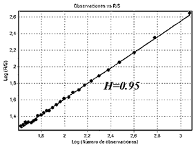 Hurst divide el rango por la desviación estándar de las observaciones originales y formula la siguiente relación: