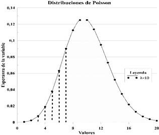 Figura 2: Ejemplo del cálculo del área bajo la curva mediante su división trapezoides. El procesamiento mostrado se realiza sobre una curva empírica trazada en Excel donde el valor de cada eje solo representa unidades numéricas y λ representa la esperanza de la variable.
