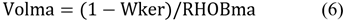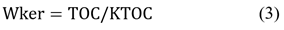 KTOC: factor de corrección (g-1 o Kg-1); Wker: masa del querógeno (Kg o g); Volrock: volumen de la roca (m3 o cm3); Volker, Volma: volumen del querógeno y de la matriz (m3 o cm3); RHOBker, RHOBma: densidad del querógeno y de la matriz (Kg/m3 o g/cm3); Vker: volumen fraccional del querógeno (v/v).
