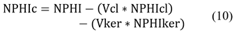 DPHIker: porosidad del querógeno por el registro de densidad (v/v); RHOBKer: Densidad del querógeno (v/v); DPHIc: Porosidad obtenida por el registro de densidad corregida por el efecto de la arcilla y el querógeno (v/v); DPHI: Porosidad obtenida por el registro de densidad (v/v); Vcl: Volumen de arcilla (v/v); DPHIcl: Porosidad de la arcilla por el registro de densidad (v/v); NPHIc: Porosidad por el registro neutrónico corregida por el efecto de la arcilla y el querógeno (v/v); NPHI: Porosidad proveniente del registro neutrónico (v/v); NPHIcl: Porosidad de la arcilla por el registro neutrónico (v/v); NPHIker: Porosidad del querógeno por el registro neutrónico (un rango de 0.45 a 0.75 v/v).