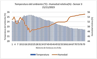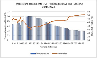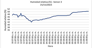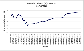 Los resultados que se obtuvieron son congruentes con las condiciones climáticas que se presentaron en esos días, sin olvidar que los sensores se encontraban en la etapa de pruebas y calibración. En las gráficas se observan valores menores de 70% de la Humedad Relativa, por lo cual, las zonas monitoreadas no se encuentran en peligro.