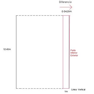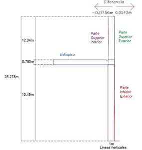En la planta baja (acceso), el muro se encuentra desplazado hacia el oriente 0.0429 m, a una altura de 12.45 m, medida a partir del nivel de piso hasta el lecho inferior del entrepiso, tal como se muestra en la Fig. 35.