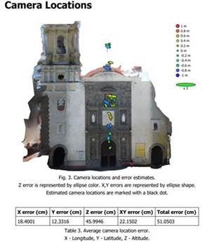 La Fig. 42 muestra con detalle el estado físico de la fachada del templo, por ejemplo, desprendimiento de pintura, reparaciones inconclusas, fisuras, principalmente, y los errores de medición de las fotos tomadas por la cámara del dron.