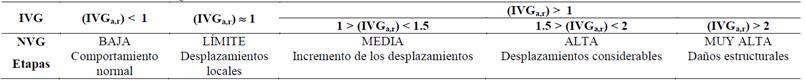 Para IVGa,r mayores que 2.0 se concluye que la vulnerabilidad geotécnica es muy alta . Los cimientos de la obra se comportan muy por encima de los parámetros de diseño. (Etapa de deformación “Levantamiento”, aparecen desplazamientos laterales y daños estructurales).